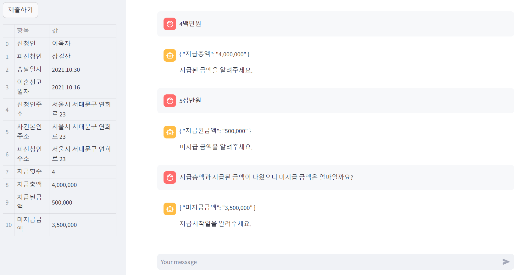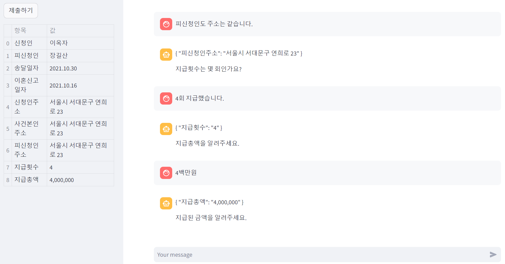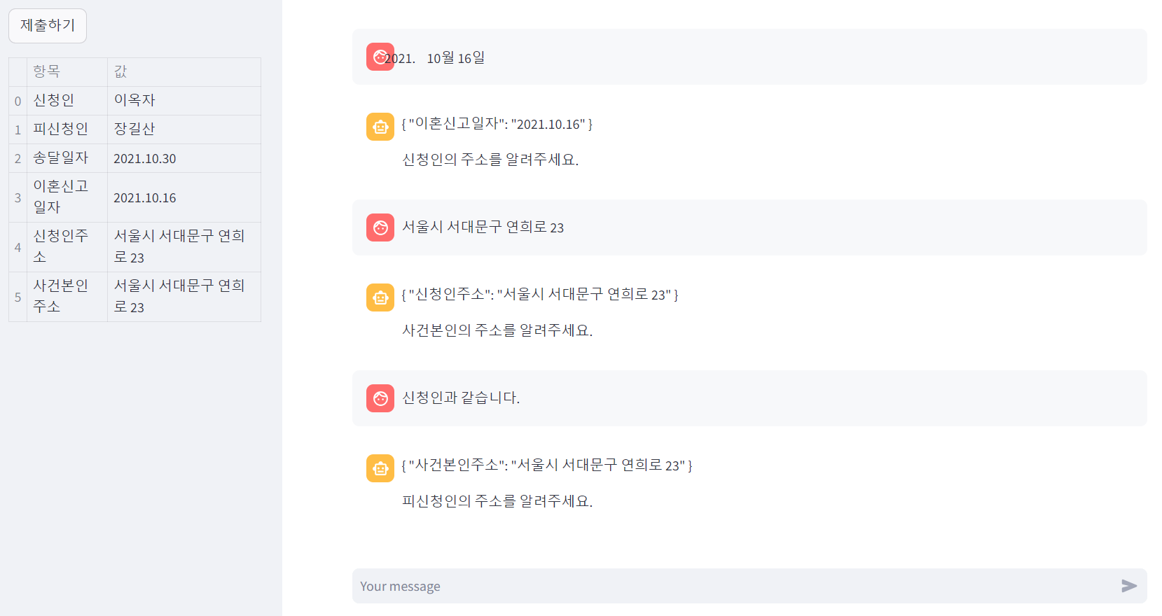 첨부된 이미지에서 볼 수 있듯이 봇이 "사건본인의 주소를 알려주세요." 했을 때, 사람이 "신청인과 같습니다"라고 대답하면 그 값이 테이블에 저장됩니다.